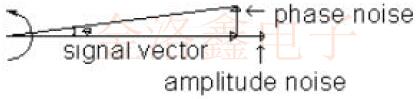 剛開始時(shí),相位噪聲可能看起來(lái)有些神秘,但是熟悉"普通"噪聲和"普通"功率譜密度的任何工程師都可以很快地提高速度,石英晶體振蕩器的輸出可以由相量圖表示. 該信號(hào)由一個(gè)向量表示,該向量的長(zhǎng)度與信號(hào)幅度成正比,該幅度圍繞振蕩器的頻率圍繞原點(diǎn)旋轉(zhuǎn),這個(gè)矢量的頂端是一個(gè)隨機(jī)的,指向振蕩器的噪聲的小矢量.該噪聲矢量可以由兩個(gè)正交矢量表示,一個(gè)正交指向信號(hào)矢量的方向,一個(gè)正交指向旋轉(zhuǎn)的方向.振幅矢量是熟悉的振幅噪聲,另一個(gè)矢量是相位噪聲矢量.顯然,當(dāng)振幅矢量改變時(shí),振蕩器的整體振幅改變,而當(dāng)相位噪聲矢量改變時(shí),振蕩器的相位改變,盡管將幅度抖動(dòng)與總幅度進(jìn)行比較很直觀,將弧度的相位抖動(dòng)與載波的幅度進(jìn)行比較似乎是任意的,這兩個(gè)量似乎無(wú)關(guān).困惑在于小角度假設(shè)的腳,該假設(shè)指出小角度的正弦等于該角度.