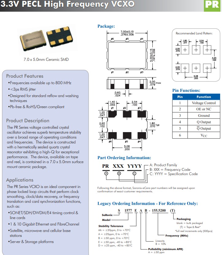 PR系列VCXO具有高Q值和卓越的性能,PRBST1122