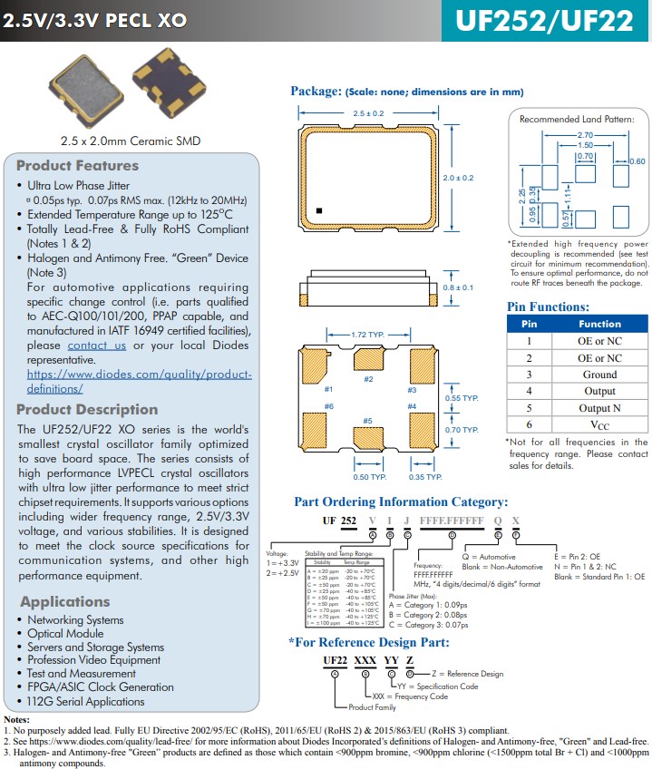 UFQ252/22 XO系列最小尺寸的超低抖動晶體振蕩器,UF2522AB150.000000QN,晶體振蕩器| FN2500258Z | Diodes Incorporated | SaRonix-eCera™ FN | 25MHz | ±50ppm | -20°C ~ 70°C |