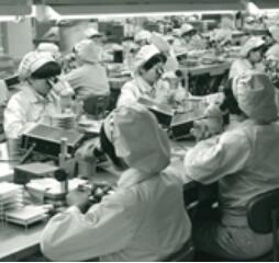 圖2:音叉晶體單元的頻率調(diào)節(jié)過程1970年代初期,音叉晶體單元的頻率調(diào)節(jié)過程.此圖顯示了工作中的婦女使用金剛石砂輪手工切割音叉晶體單元的前邊緣,以調(diào)節(jié)頻率.