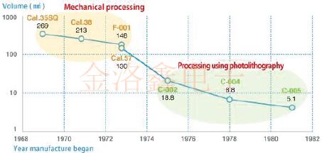 同時(shí),另一項(xiàng)新技術(shù)正在悄然開發(fā),以支持光刻技術(shù)的實(shí)施.該公司的準(zhǔn)備工作是水密的.終于在1975年開始量產(chǎn)"C-002",這是第一款應(yīng)用光刻技術(shù)的音叉晶體裝置(圖4).其外部尺寸為2mm(半徑)x6mm(長度).它很小,僅為上一代晶體單元"Cal.57型"的1/7(圖5).他們成功地使晶體裝置更加緊湊.