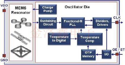 MEMS振蕩器由與模擬振蕩器IC封裝在一起的MEMS諧振器芯片組成.如圖1左側(cè)所示,有不同類型的MEMS諧振器可滿足不同的應用需求.MEMS諧振器連接到模擬IC上的MEMS Oscillator專用電路塊,并通過靜電激勵驅(qū)動.