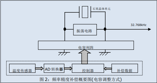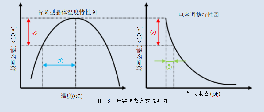 電容調(diào)整方式指通過改變石英振蕩頻率進(jìn)行補(bǔ)償?shù)姆椒?。該方式利用振蕩頻率隨石英晶體振蕩器的振蕩負(fù)載電容的增減而變化 的特點(diǎn),補(bǔ)償因周圍溫度而產(chǎn)生的頻率變動。簡易原理用圖 3 表示。