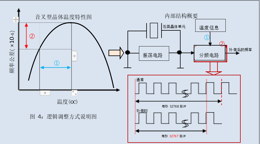 圖 3 左表示音叉型石英晶體振蕩器的頻率溫度特性,圖 3 右表示頻率隨負(fù)載電容而變化的電容調(diào)整特性。補(bǔ)償?shù)木唧w內(nèi)容包括 根據(jù)周圍溫度①求出頻率變量②,并推導(dǎo)出該頻率變量②相應(yīng)的負(fù)載電容變量③。將該溫度相應(yīng)的負(fù)載電容變量作為補(bǔ)償值呼出 后,對振蕩頻率進(jìn)行補(bǔ)償。該方式直接對振蕩頻率進(jìn)行補(bǔ)償,因此可以把實(shí)時(shí)時(shí)鐘模塊的振蕩輸出補(bǔ)償為高精度后作為低頻的休 眠時(shí)鐘使用。