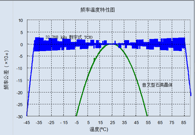 根據(jù)市場要求(能以極低的耗電量保持現(xiàn)在的時(shí)刻),用于計(jì)時(shí)的低頻 時(shí)鐘一般采用音叉型石英晶體振蕩器。 音叉型石英晶體振蕩器驅(qū)動時(shí)耗電量少的反面,其頻率溫度特性為圖 1 所示的二次曲線。所以,在進(jìn)行時(shí)鐘誤差設(shè)計(jì)時(shí),除了室溫(+25℃) 條件下的頻率公差以外,還應(yīng)當(dāng)考慮到二次曲線的頻率溫度特性公差。 假設(shè)在-40℃的條件下使一般的音叉型石英晶體振蕩器連續(xù)工作 1 個(gè)月, 那么其振蕩頻率公差將達(dá)到-150×10-6 左右,相當(dāng)于出現(xiàn) 6 分鐘(月差 6 分鐘)以上的時(shí)間誤差。 為此,設(shè)計(jì)人員也許會考慮使用 AT 型石英晶體等頻率溫度特性較好的 振蕩器作為波源。但 AT 型石英晶體的振蕩頻率通常達(dá)到幾 MHz,所以 需要在振蕩電路中進(jìn)行分頻,以達(dá)到用于時(shí)鐘時(shí)的頻率。 這時(shí),在振蕩電路中消耗的電流將達(dá)到使用音叉型石英晶體振蕩器時(shí)的數(shù)百倍。因此,我們認(rèn)為把 AT 型石英晶體用于作為時(shí)鐘 波源的方法不符合市場要求。