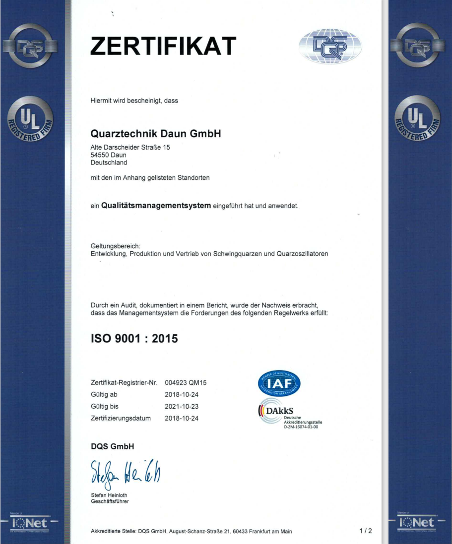 The DQS (Germany Quality Assurance Association) has awarded Quarztechnik Daun GmbH the following Certificates: DIN EN ISO 9001 and IQ NET 1909001 DE 004923QM.
